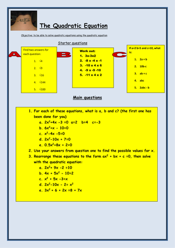 Quadratic Equations Math Worksheets|Printables PDF for kids Quadratic equations is equation which has highest degree of power as square. Quadratic equations / expressions can be solved in several ways. One of the easiest way is by splitting the middle term. Different teachers can have different way of teaching quadratic equations but our worksheets are suitable for all. Solve by Quadratic Formula Worksheets and Solutions - Online Math Learning Solve by Quadratic Formula. Objective: I can solve trinomials using the quadratic formula. Given the trinomial or quadratic equation ax 2 + bx + c, we can find the values of x by using the quadratic formula: Read the lesson on quadratic formula for more information and examples. Fill in all the gaps, then press "Check" to check your answers.